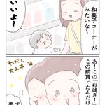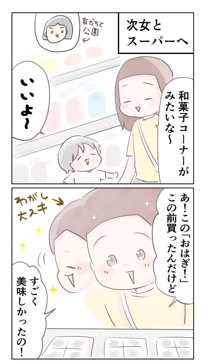 スーパーで次女に話しかけていたと思ったら隣のおばあちゃんも一緒に聞いてて恥ずかしかった~!!!!(笑)おばあちゃんもおはぎ買ってた😂✨ #やさしい持ち込み2023 #漫画が読めるハッシュタグ #育児漫画