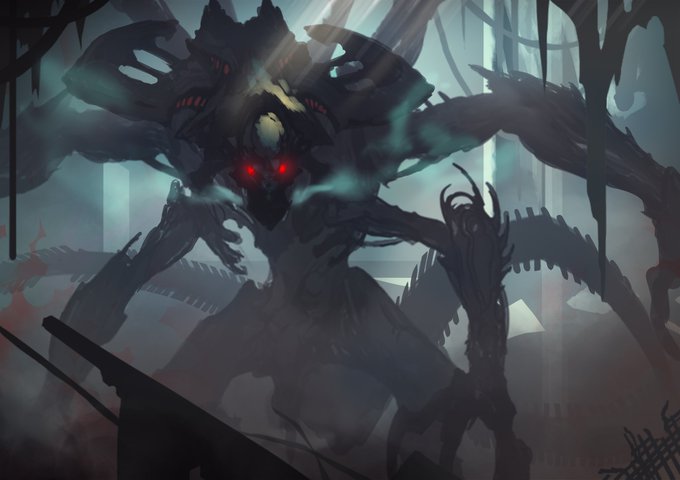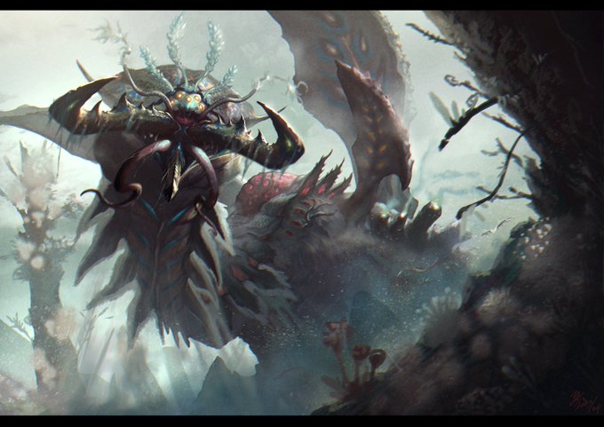 #やじるのえ #monsterdesign #creaturedesign コンセプトアート風 棘だらけの腕で獲物を捕まえ、、、 口から麻痺毒のガスを噴出して動きを封じ、、、 百足の足のような不思議な形の歯でガッチリホールド。 アリジゴクのようにストロー状になった歯で ・・・ 後はご想像にお任せします。