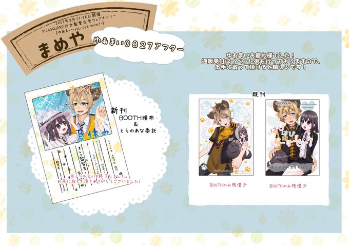 【通販宣伝】 ■新刊🐯委託→ ec.toranoana.jp/joshi_r/ec/ite… ■新刊&既刊BOOTH→ mameya0729.booth.pm 全部ラギ監♀ちゃん!!!!🐆🌸 よろしくお願い致します🙏 #ゆあまい0827アフター