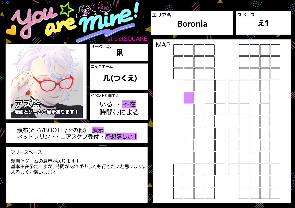 #ゆあまい2nd_お品書き 5/13〜14に開催されるゆあまい2ndに参加させていただきます。 【Boronia さ9】オールキャラ×監♀︎スペースです。 展示(新作漫画と過去作再録)と既刊通販の予定です。展示漫画は今描いているので多分間に合うはずです。 よろしくお願いいたします!!