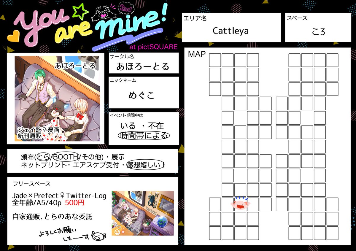 #ゆあまい2nd_お品書き 5/13-14開催のゆあまい2ndに参加します~‼️ 【Alyssum】エリア【あ:A5】スペースにて イデ監♀のイラスト、漫画(間に合えば🙏)の 展示とネットプリントを予定しております。 よろしくお願いします~😸