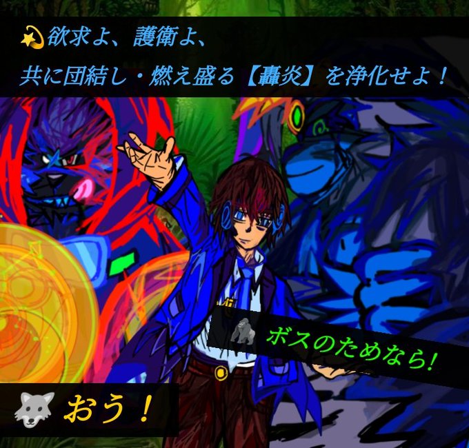 #ゆうさくの旅路2022 #イラスト 2022/08/18・6:57〜 💫行きますよ?二人とも… バイオ・アストロミー… 接待を開始します!\(^o^)/ ⬇ 🦍🐺おう!\(^o^)/ #猿和田ゴロウ… #森ノ宮冥古… 対応▶🔥#赤坂秋喜… twitter.com/SwXPrZtHrY5w…