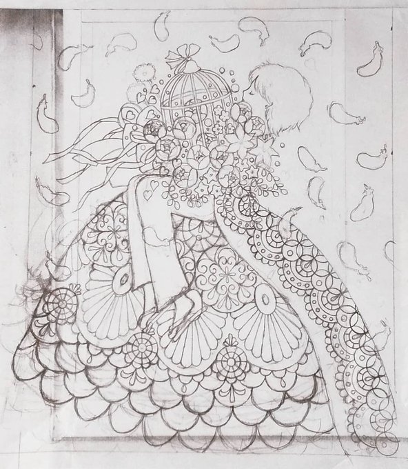 この前描いた絵の下絵。 服の裾の部分が好きだったけど、この度のパネルでは寸法が小さく入れることができなかった。 #皆さん線画と塗った後を見せてください #イラスト #絵 #色鉛筆 #illustration #art #ゆきんこ