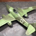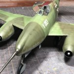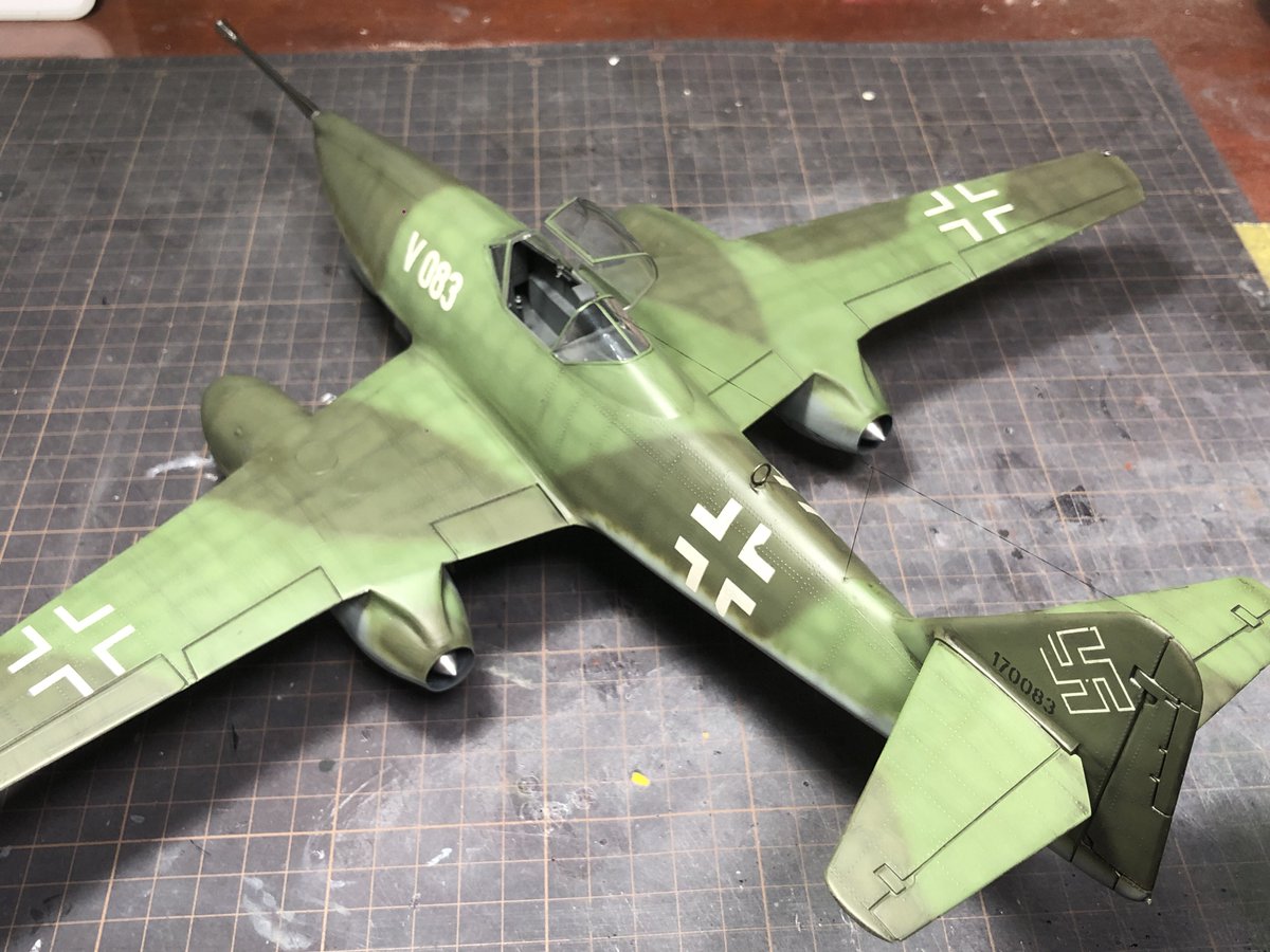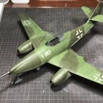 #ゆく年くる年262祭り タミヤ100 Me262、今日の進捗。 機体番号と部隊マークを描きました。キットのモールドは凹凸が混在しています。凹のところだけスミ入れしました。明日ツヤ調整して完成かな。