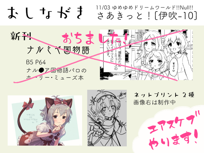11月3日開催の存在しないイベント、ゆめゆめドリームワールド_Nullのお品書きなのです。存在しないのにお品書きは存在致します。当日にBOOTH(fish-g.booth.pm)で公開予定!まだ手元に無いので現物の写真が無いのだ。当日が待ち遠しいです! #ゆめゆめドリームワールド_Null #成宮由愛