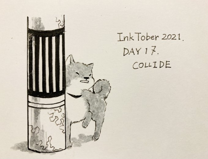 【#ゆめ画材インクトーバー2021 17日目】 ペン:ZIG イラストレーション ベーシックセット IKTB-21/5V 紙:ケント紙 お題はCOLLIDE(衝突)。グレーがやっぱり使いやすいです。 犬も歩けば棒に当たるといいますが、電柱にぶつかった犬を知ってます。担当の飼い犬です #inktober #inktober2021