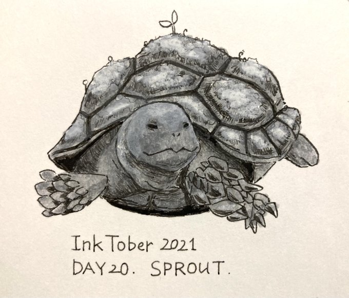 【#ゆめ画材インクトーバー2021 17日目】 ペン:ZIG イラストレーション ベーシックセット IKTB-21/5V 紙:ケント紙 お題はSPROUT(芽、もやし)。ミリペンと筆ペンで影を作るのが難しくも楽しかったです。 陸亀の目は意外と吊り上がってるんですね🐢 #inktober #inktober2021