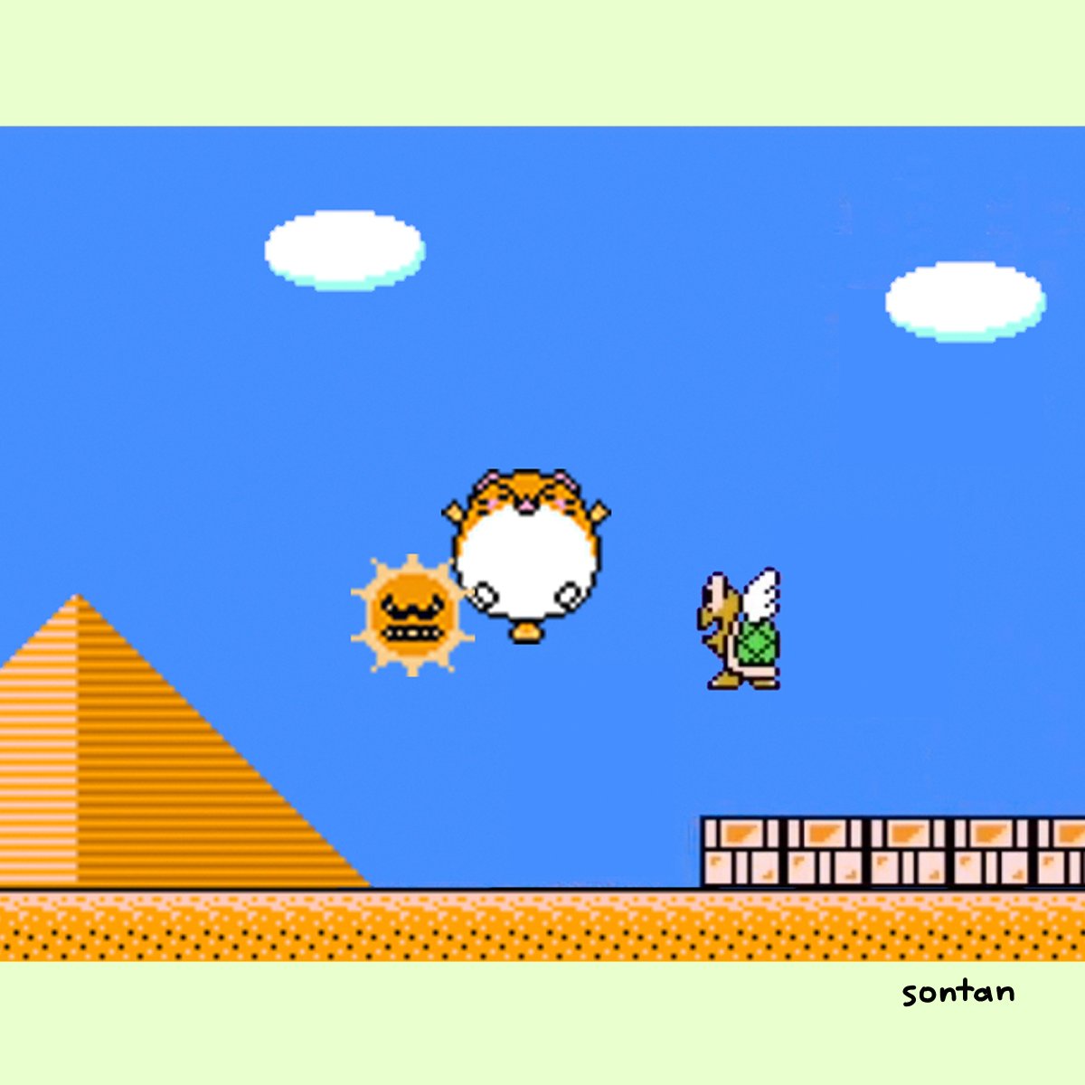 5月なのに最近は暑いですっ!☀ 太陽さんも追いかけてきてイライラしてますね😰 あっ、やられた😦💦 #ゆるいキャラクター #ゆる絵 #ゆるキャラ #ニャンプク #スーパーマリオブラザーズ3 #クラシックゲーム
