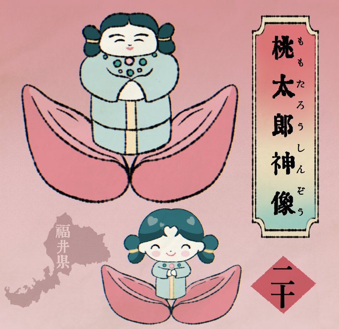 #ゆるかわ郷土玩具図鑑 19人目は福井県出身の『桃太郎神像』だニャ😸 彼は気比神宮から子育て・子授けのお守りとして授与されるニャ! #イラスト #春の創作クラスターフォロー祭り #レトロ #絵 #桃 #キャラ