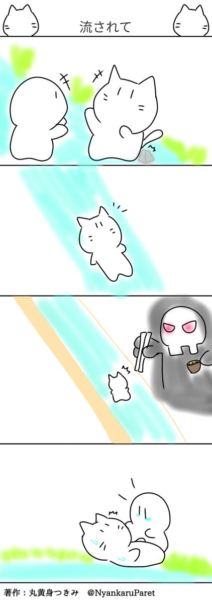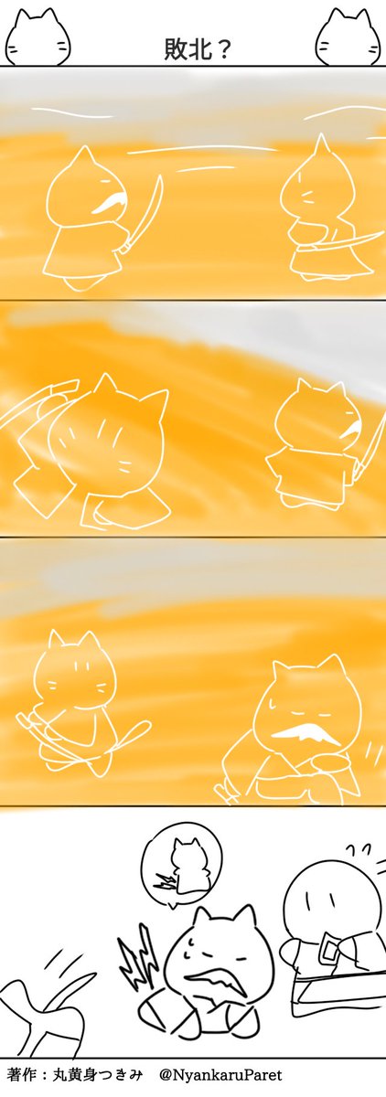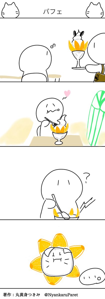 第24話 むげんねこ オレンジパフェを食べるふぃん。 あれ、にーてぃはお留守番では・・? #4コマ漫画 #漫画が読めるハッシュタグ #ゆるまんが #パフェ #明日は休日 #夏の創作クラスタフォロー祭り