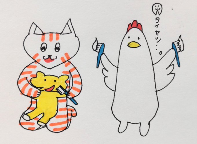 おはようございます!! #よい歯の日 🐘の仕上げは、😺がしっかりと!! 🐔は、歯ブラシ持って応援だ!!🤣 今日も素敵な月曜日を〜😉 #イラスト好きな人と繋がりたい #絵描きさんと繋がりたい #みんなで楽しむTwitter展覧会 #イラスト