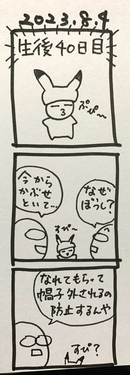 今日の育児漫画。 生後40日目、よしげん育児奮闘記。 ピカチュウの帽子を被せてみました😗 生後10日ぐらいに被った時より サイズがピッタリになってきたので 成長を感じてます🥳✨ 帽子外すの防止せねば #よしげん育児奮闘記 #育児漫画