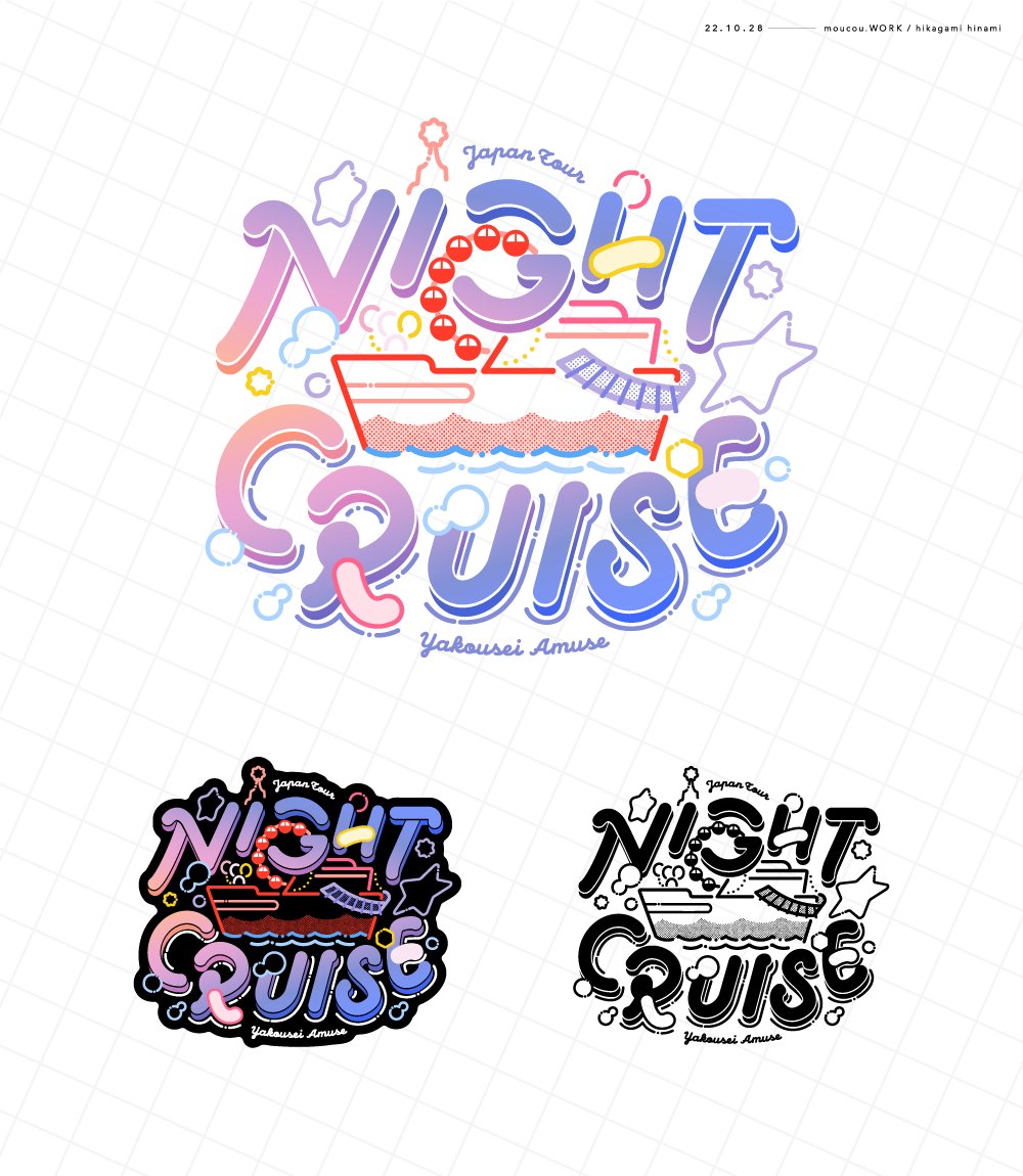 【告知】 夜光性アミューズ(@Yoruamiofficial ) #よるあみ の全国ツアーロゴ グッズデザインを担当しました🎟 夢のような #NIGHTCRUISE🚢🌟 推しとのとっておきのチケットを持って テーマパークを楽しんできてください💖 オフィシャル抽選🎟は 本日23:59までだそうです💨