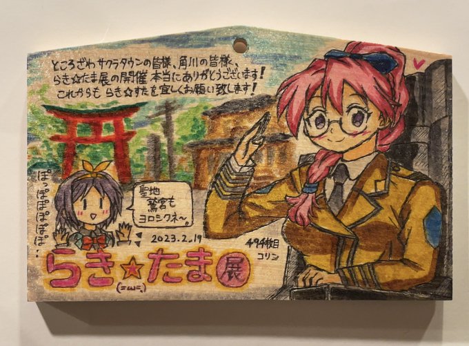 ところざわサクラタウンの武蔵野令和神社に鷲宮神社絵馬を奉納しました。 とあるシリーズより、御坂美琴コス柊かがみとインデックスコス泉こなたを描きました。 開催中の『らき☆たま展』が盛り上がりますように(・∀・) #らきすた #らきたま展 #角川武蔵野ミュージアム