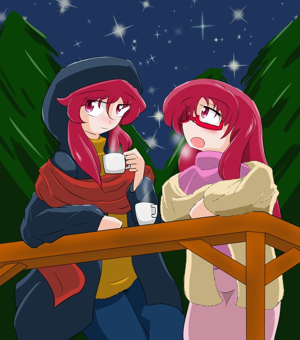 りょくちゃんの良く視える目は綺麗な物を見るのが好き。冬の星空もその一つです りく姉は付き添い。妹が熱中しすぎて体が冷えても見続けてしまうのを防ぐための、センサー代わりでもあります 寒い中で熱いココアを体に流し込むのもまた格別だそうで😁 #ケムリクサファンアート #りくりょく #百合