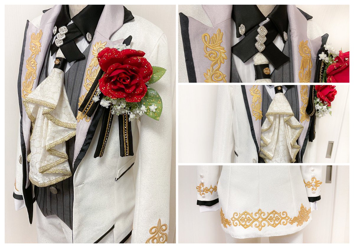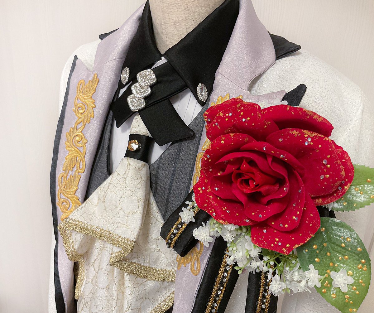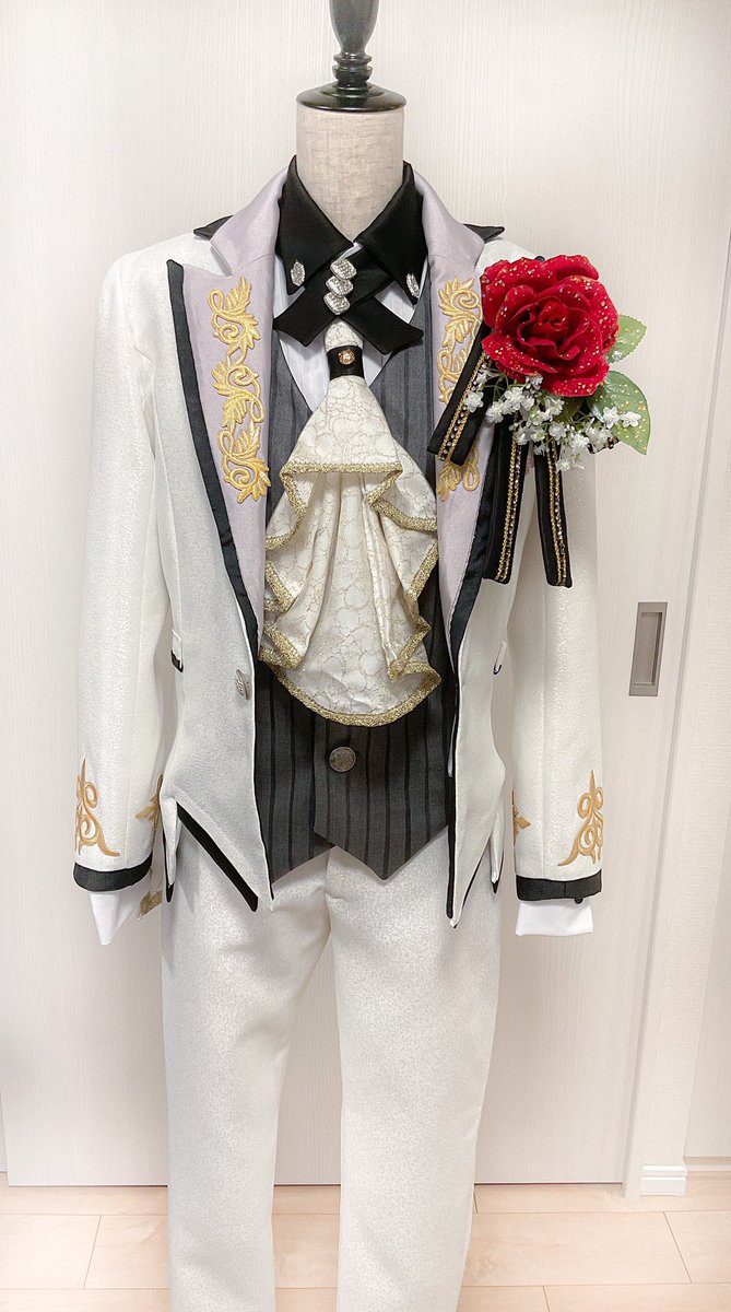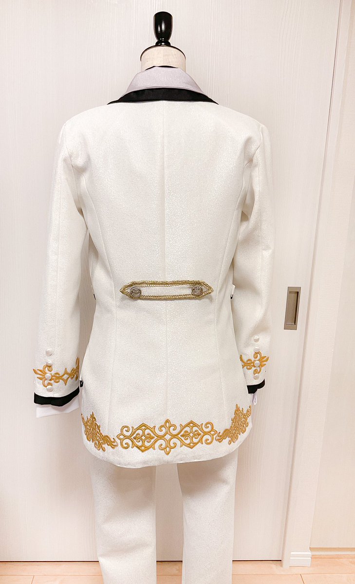 青柳冬弥 トラウム•シンガータキシード 華やかに仕上げるためにラメの織り込まれている生地をメインに利用し、随所にキラキラをちりばめました! フォーマルな衣装なのでカッチリ仕上がるように丁寧に制作。めちゃくちゃ時間かかった😂 #プロセカ衣装部 #りりかるルナさんの衣装製作 #prsk_cos
