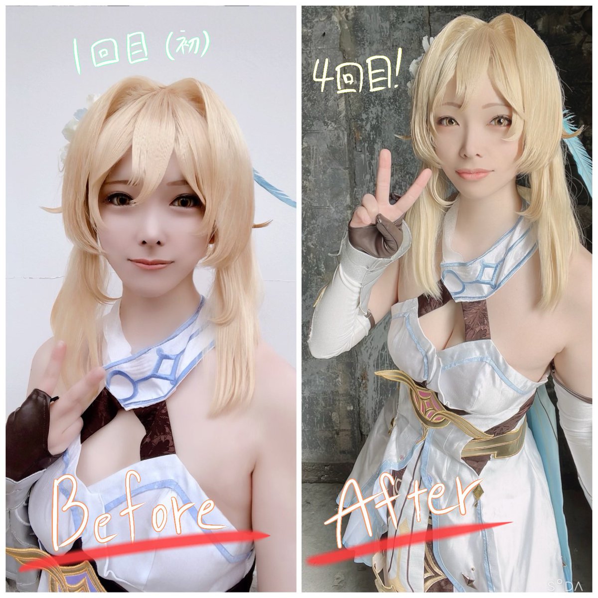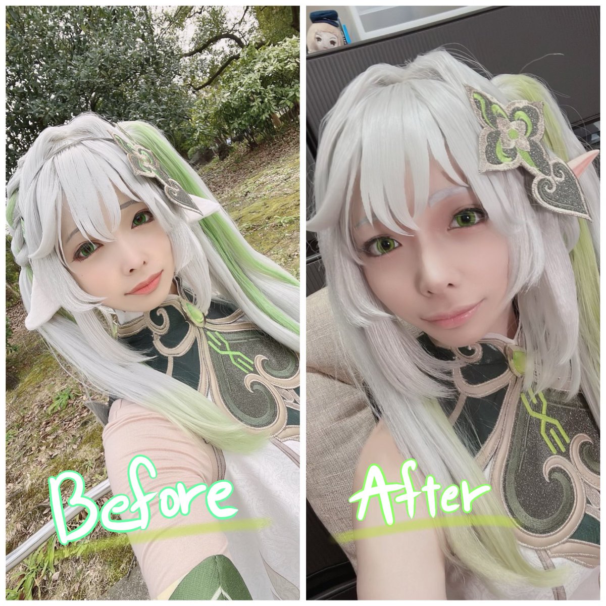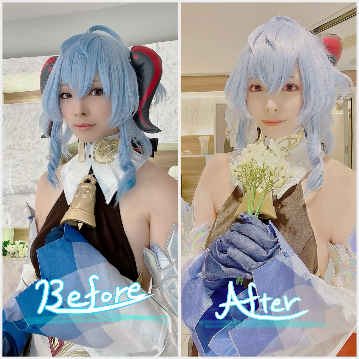 原神before👈 👉after!!!!! なんか色々結構違い出てるよね🤔多分..... 甘雨に対しては メイク的には1回目の方がいいけど角の位置考えるとafterの方なんだよね💦 そして 今まで刀剣、ツイステ以外 何回も同じキャラ出さなくてこんなにやるの珍しい👀‼️もっとやりたい欲! #るあのテイワットレコード