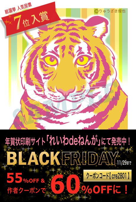 れいわdeねんがさんで 11/23(火)〜11/29(月)の期間にクーポンをご利用頂くと60%offになるそうです!! もし年賀状で悩んでいらっしゃる方がいましたらぜひ! #れいわdeブラックフライデー reiwadenenga.jp/product/catego… 商品番号 14377 クーポン cre0854 こちらが入賞させて頂いたデザインです↓