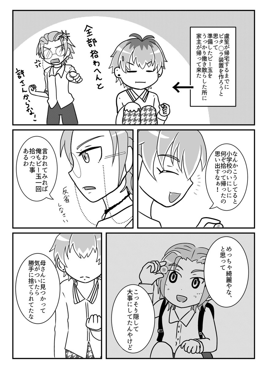 お題「ビー玉」で参加させて頂きます! 盧笙の幼少期捏造してます💦 小学校の時に拾ったビー玉を大事にしていた子がいたのを思い出したのと、ビー玉=ピタ○ラ装置なイメージで 盧笙が簓に塩対応してるの好きです(1/2) #ろささ版週ドロ週ライ