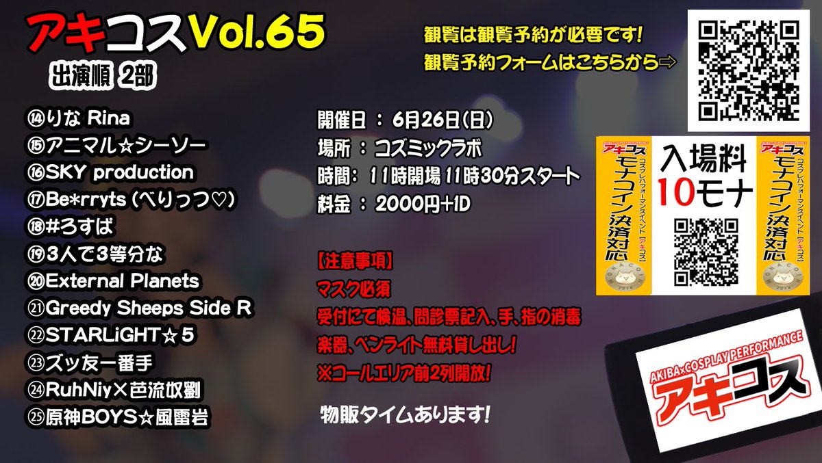 6/26のアキコス明日です❤️🔥 #ろすぱ は2部5番目です🌈 2列目まで声出しできるようになったみたいなのでたくさん盛り上がってほしいな〜!! 明日も暑いので暑さ対策バッチリでよろしくね🌞 観覧予約急いで💨 akicos.com #アキコス