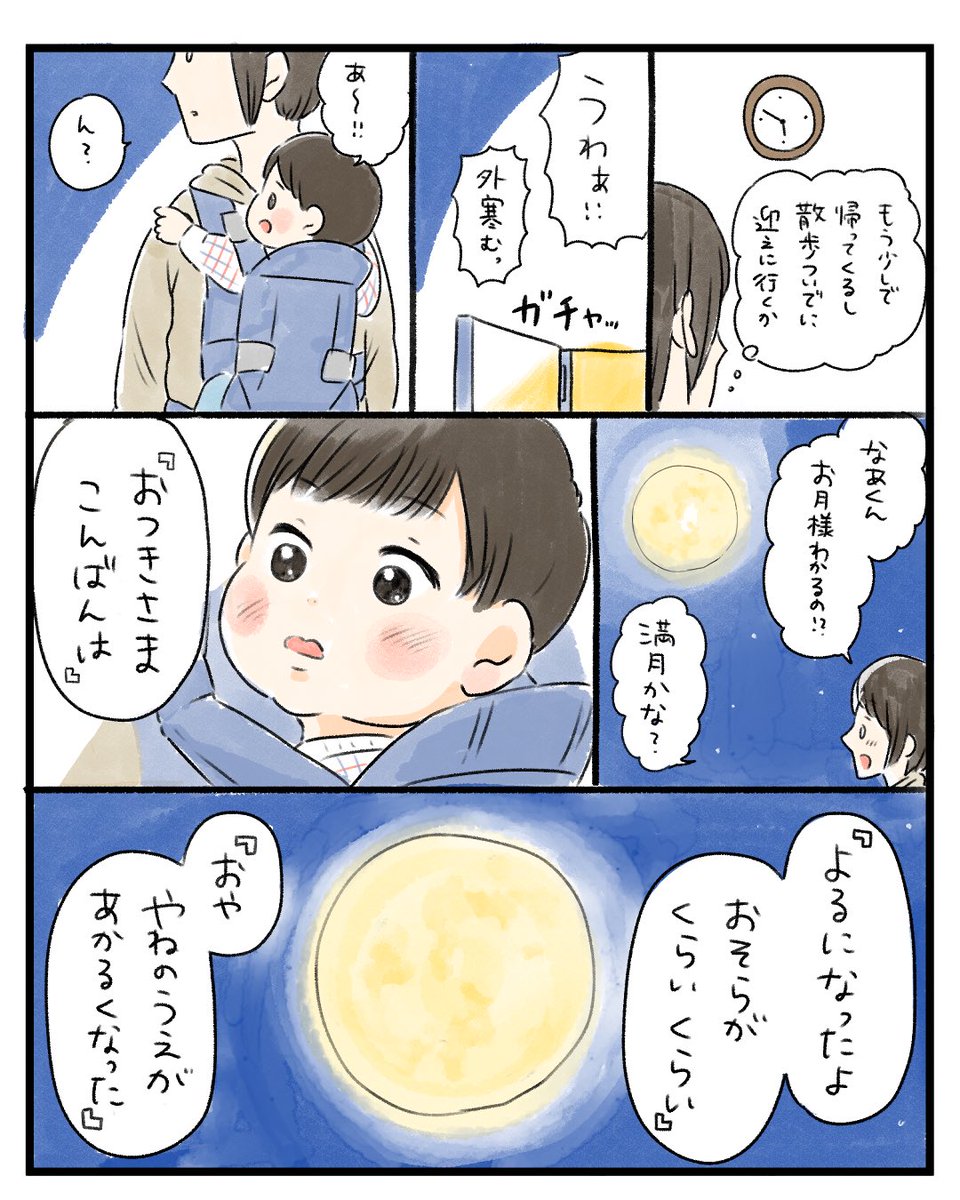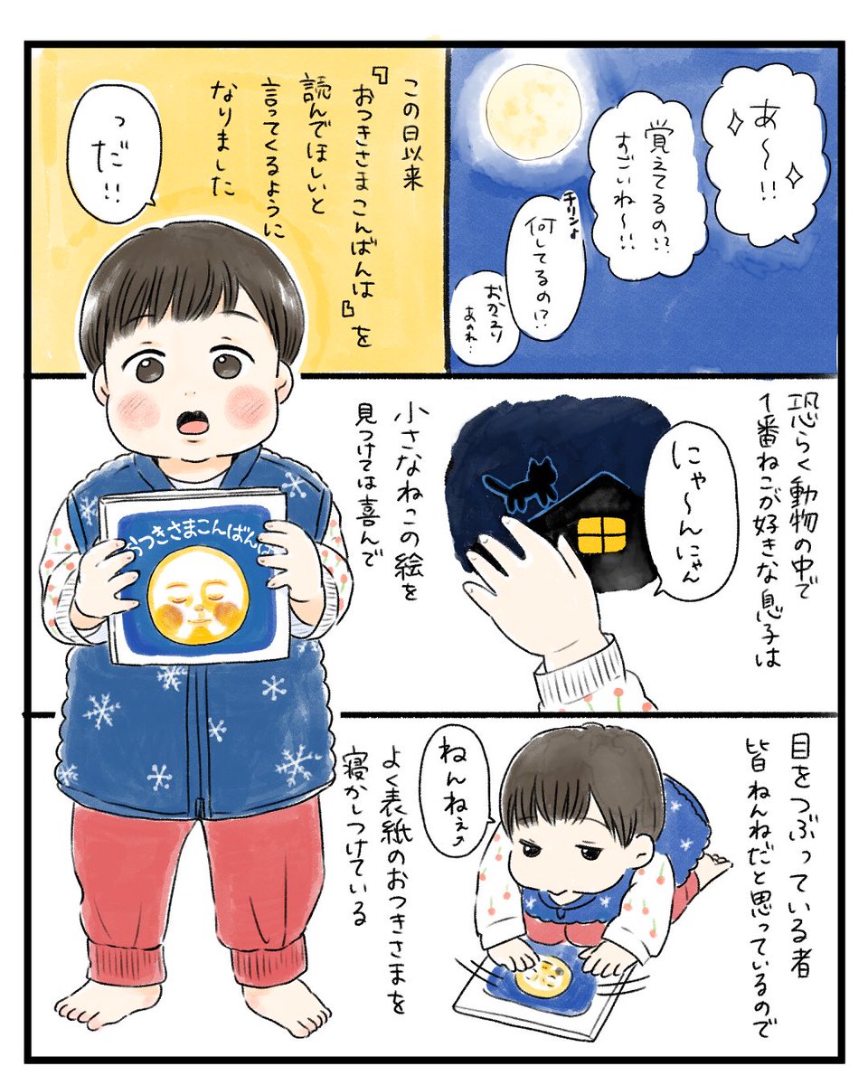 おつきさまがわかった日の話🌕(4p) 最近寝かしつけのときに『おつきさまこんばんは』を無限回読まされるのですが、毎回息子がものすごく喜んでくれるので私もこの絵本が大好きになりました🥰 #育児漫画 #エッセイ漫画 #漫画が読めるハッシュタグ #わが家のまんが大賞