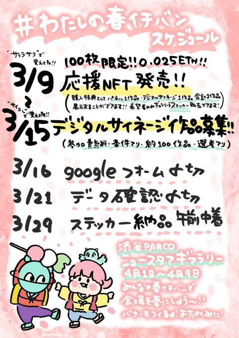 手描きで見づらいかもしれませんが 取り急ぎスケジュールを出しました🌸 #わたしの春イチバン は3/9より “春”テーマの作品を募集いたします ニュースタアギャラリーに あなたの春イチバンを吹かせよう🌬🌸 会期中、会場がどんどん春になる 仕組みになっています🌸🌸🌸 続報をお楽しみに🫴🌸✨