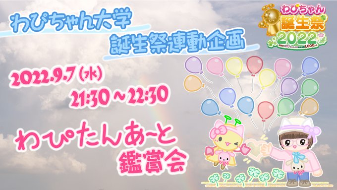 🌸拡散希望🌸 誕生祭最後の企画、わぴたんあーと鑑賞会 明日7⃣日、専用タグで投稿していただいた ファンアートを紹介する配信をやるよ! ぜひ遊びに来てね🎀*•ᆺ•)o💕 📝時間 21:30~22:30(予定) 📝配信枠 youtu.be/zbTDc-mB1-s #わぴちゃん大学 #わぴちゃん誕生祭2022