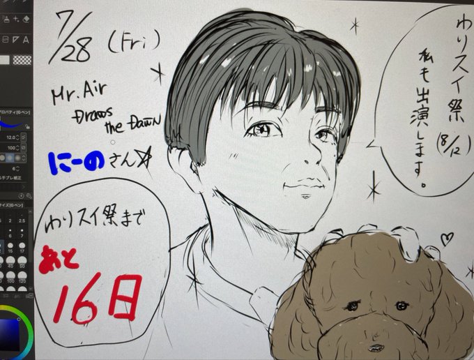配信前にわりスイ出演者告知を描くおっさん 本日のカウントダウンはMr.Air draws the downのにーのさんです!! 絵空事 / Mr. Air Draws the Dawn youtu.be/MOa6UM6PBIY @YouTube #わりとスイート #イラスト