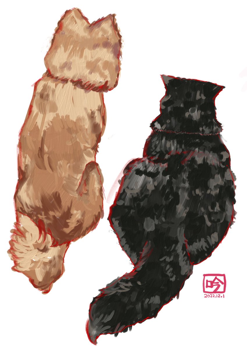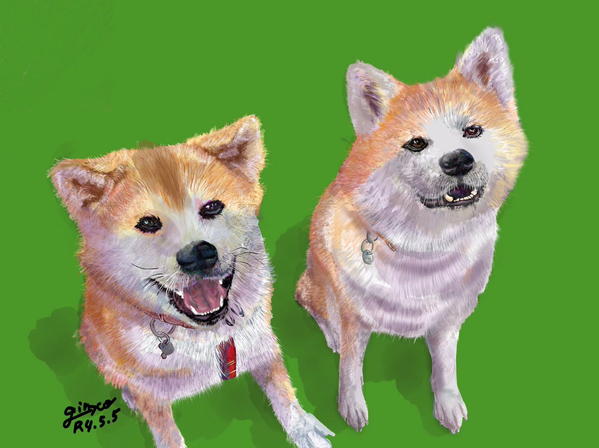 秋田犬虎錦と結陽@kokin0408 さん宅の虎錦ちゃんと結陽ちゃんを描かせて頂きました。2頭の背中は幸せをくれると思います。モデルになってっくれてありがとうございます。時期的にトレーナー案かなぁ〜。 #わんこドロー #AdobeIllustrator #AdobeFresco ※ご家族以外の無断転載・無断使用禁止