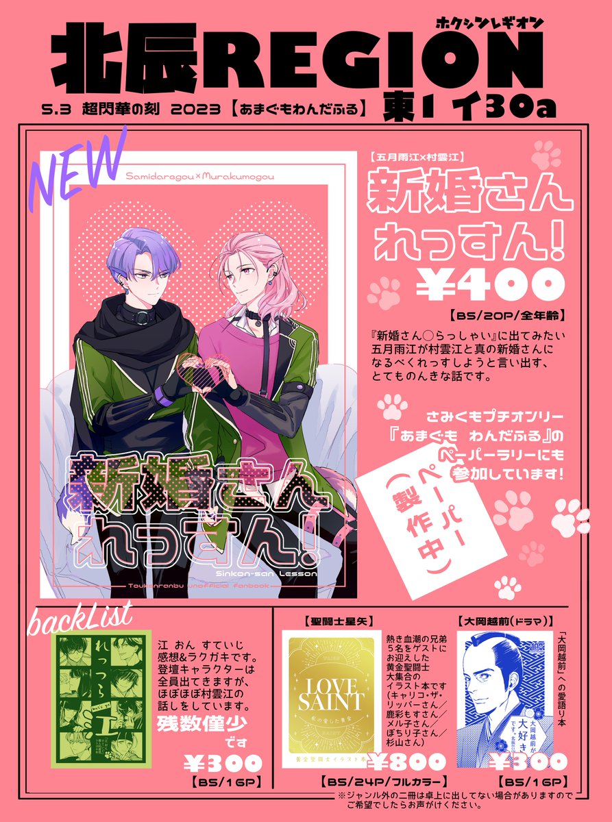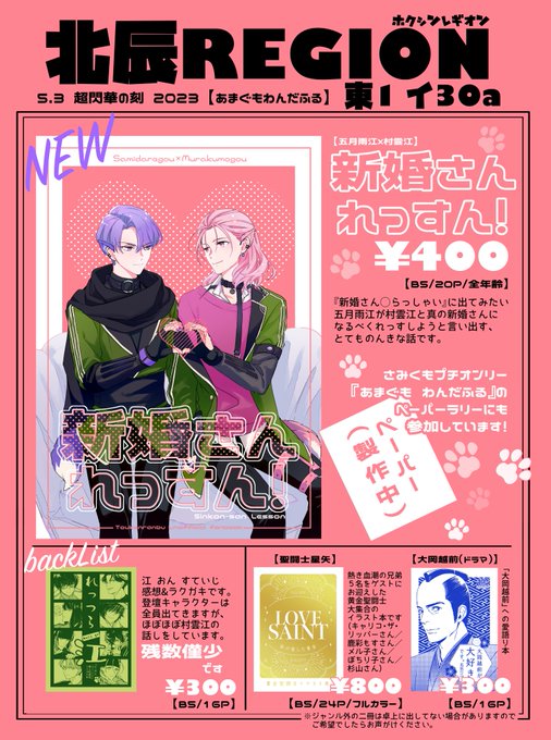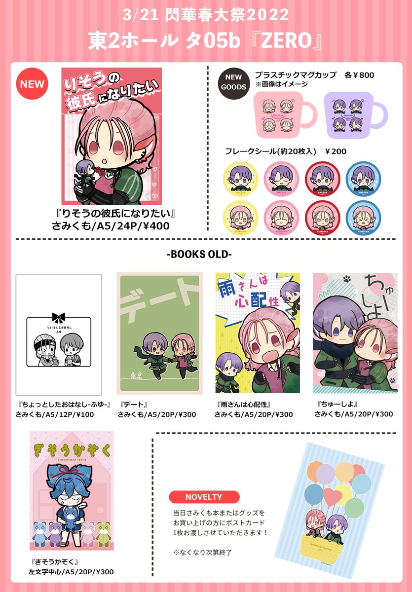 5/3超閃華の刻のおしながきです! 当日はさみくもプチオンリー「あまぐもわんだふる」参加しております。 ノベルティにペーパーとポストカードをお付けします👍 ペーパーラリーにも参加してますので、ペーパー持っていってください! 今からペーパー描きます! pixiv.net/artworks/10764… #わんふる0503