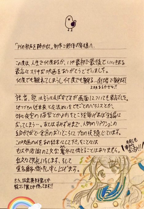 映画『 #アイの歌声を聴かせて 』のファンの方から、#アイうた の制作スタジオである #JCSTAFF さんへお手紙を書いていただきました👏❗️🤓✏️ スタジオにアナログの手紙を書くことはあまりないと思いますが 制作側の皆さんはこのようなお手紙は絶対に嬉しいです🍀それに絵も可愛い💕☺️thank you💌💓