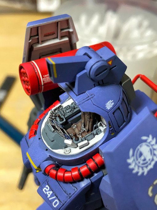 #太陽の牙ダグラム #アイアンミーティング2 やっと墨入れ終わりトップコート! 毎度のワンパターンで、コクピットと股間に力入れてます(⁈)。3枚目は今作の好きなアングル!❗️サバロフの時の方が作り込んでたなぁと反省してます。😅 後は汚し塗装で完成のハズだっ‼️😆