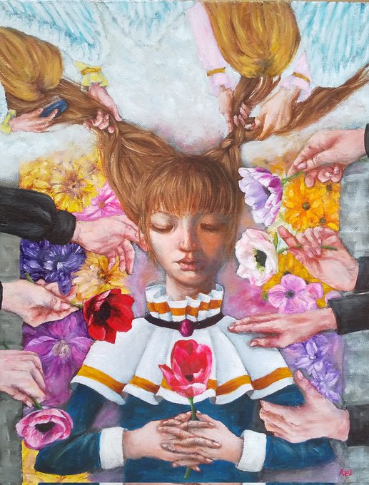 #アイオライト企画_SleepingBeauty @i_OLiTE_ アイオライトさんの企画に参加します ~永遠の眠り~ サイズF6の油彩画「旅立ちの刻」 黄泉の国に旅立とうとする少女、別れを惜しみ花を手向ける人々、迎えの天使達 #oilpainting #oiloncanvas #artwork #fineart #fantasyart #portrait #angel #油彩画