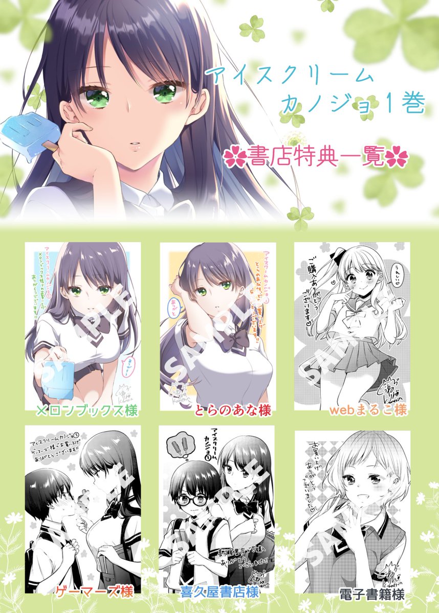 【書店修正有】アイスクリームカノジョ単行本①巻が3月9日に発売されます!ラブコメですよ! 各書店様特典をまとめたのでこちらをご参考に、購入を検討していただければと!3枚目はそのまま書店員様に見せて頂ければ予約もできますので何卒…!! #マガポケ #アイスクリームカノジョ #アイカノ