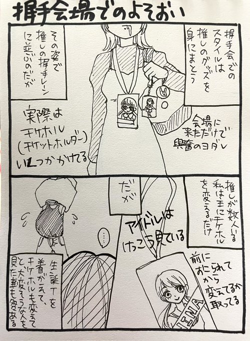5年以上現場オタ(乃木坂・48)した 女アイドルオタの偏見にまみれた 女アイドルオタクのあるある⑥ 握手会会場での装い 総じてオタクというものは、推しを身に付けたがる #アイドル #アイドルのいる生活 #漫画が読めるハッシュタグ #マンガが読めるハッシュタグ