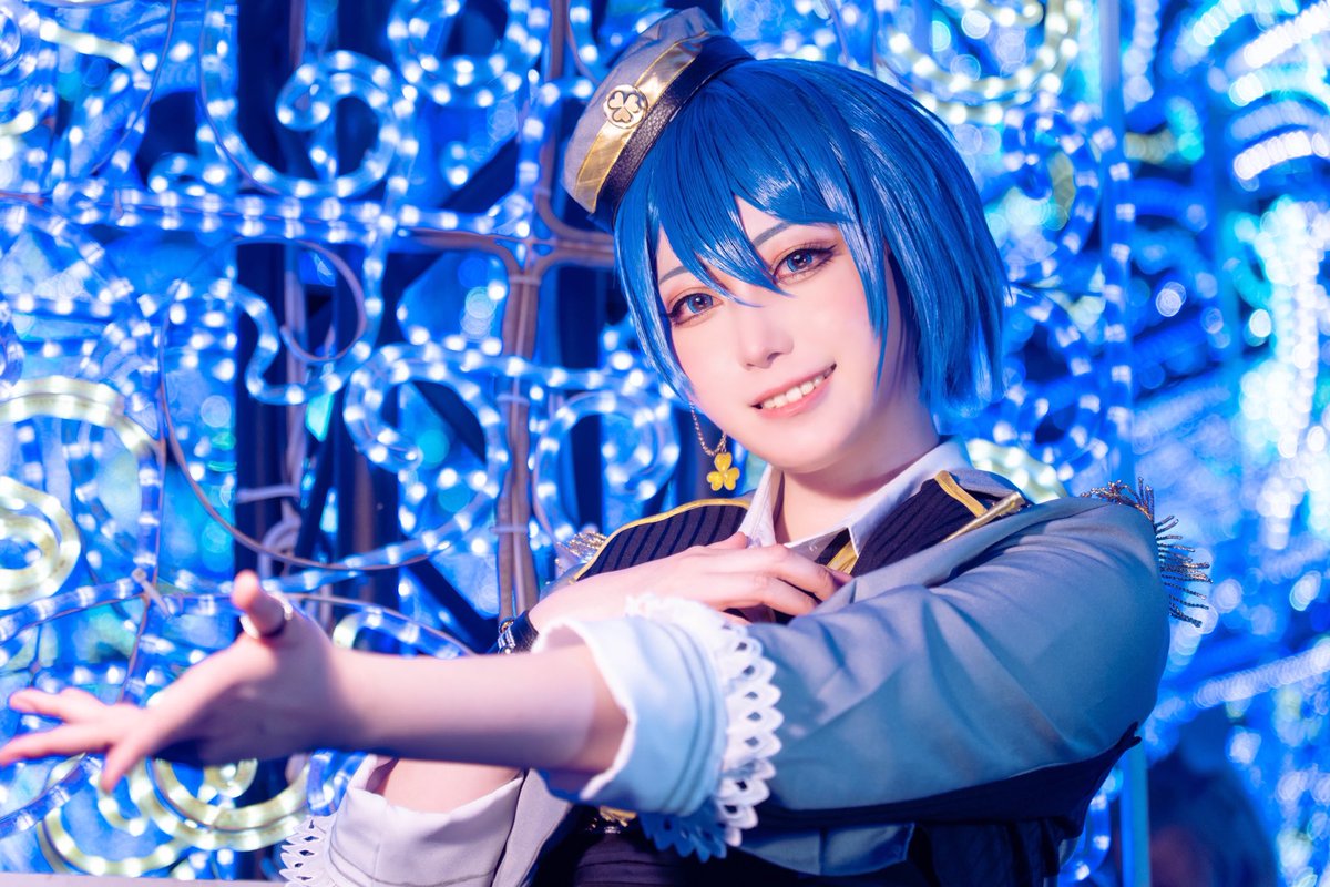 #アイドルコスモスナップ 【作品名】 プロジェクトセカイ カラフルステージ! feat.初音ミク 【キャラクター名】 桐谷遥 【ポイント】 衣装は自作しました。 遥ちゃんのイメージカラーの青色のイルミネーションの前で撮影していただいたお気に入りの1枚です。
