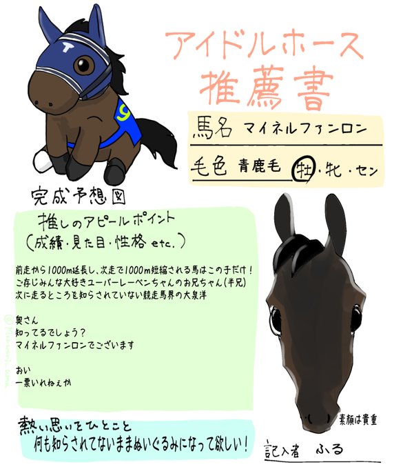 ステイゴールドラストクロップ三銃士の一頭! ユーバーレーベンちゃんのお兄ちゃん! 競走馬界の大泉洋! 鼻の穴はどの馬より小さい! マイネルファンロンをよろしくお願いいたします!! まるわりさんのテンプレお借りしました😊 #アイドルホースオーディション twitter.com/Marwari_uma/st…