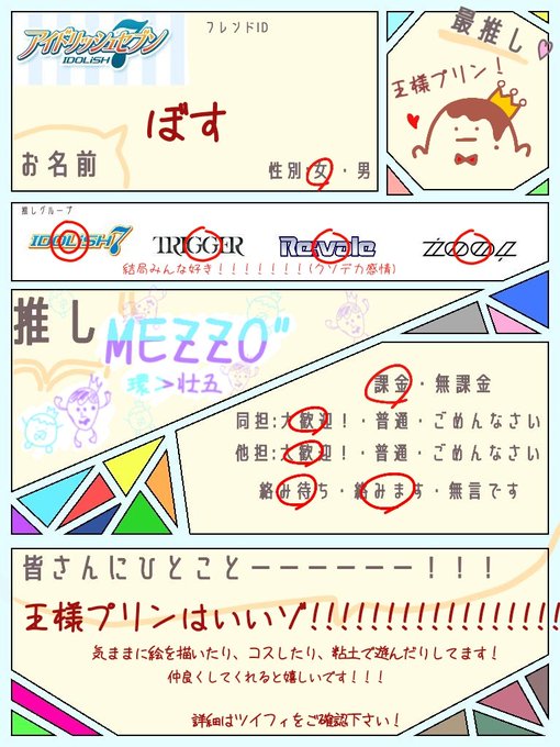 素敵なテンプレお借りしました…✨ 基本箱推し、めっぞとフラウェ組が特に好きです! 普段はまったり絵を描いたりして楽しんでます😌色んな方と仲良くなりたいです〜! #アイナナ好きさんと繋がりたい #アイナナ好きな人と繋がりたい #アイナナ絵描きさんと繋がりたい