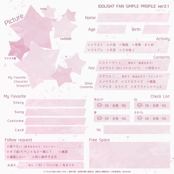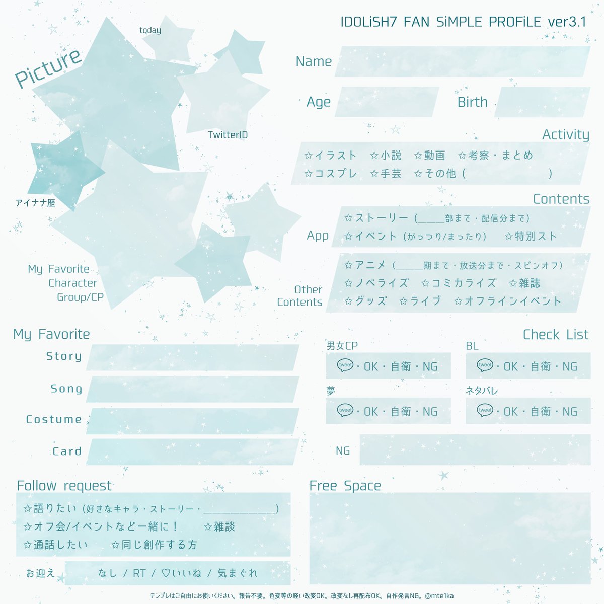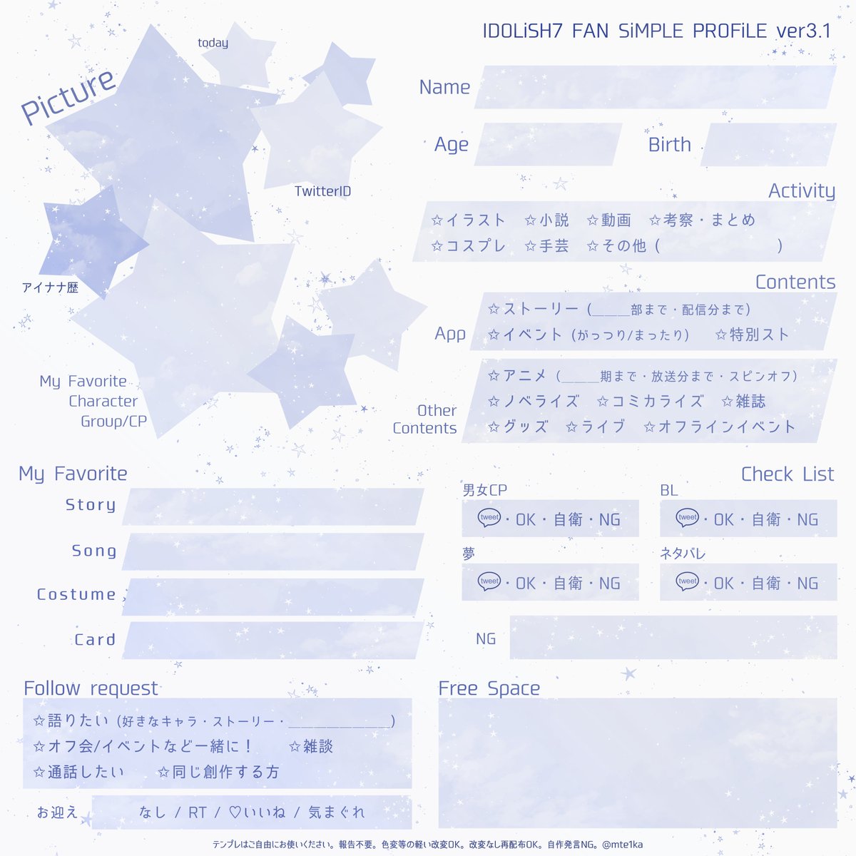 【テンプレ配布】 アイナナ版プロフ簡易版ver3.1色変えバージョン①です。 🌟報告不要 ⚠️自作発言NG 🆗色変えなどの軽い改変・改変なしの再配布 テンプレ置き場:tktemplate.tumblr.com/tagged/i7templ… #アイナナ自己紹介カード