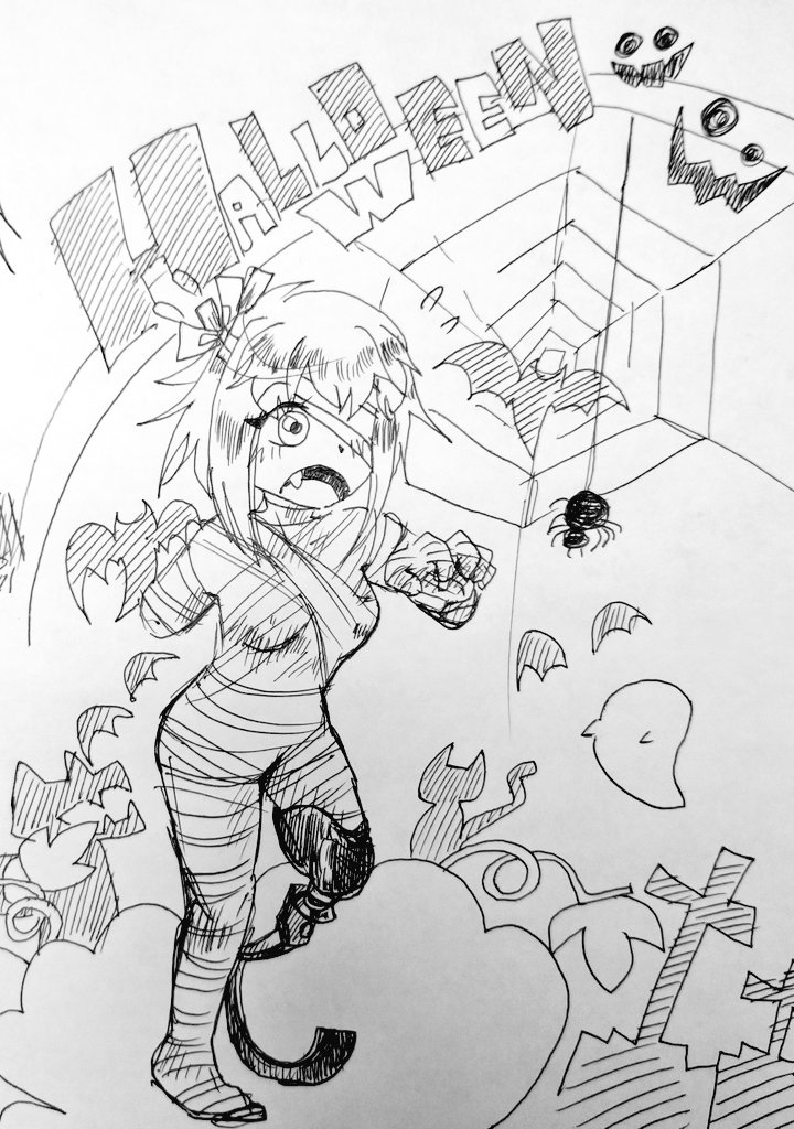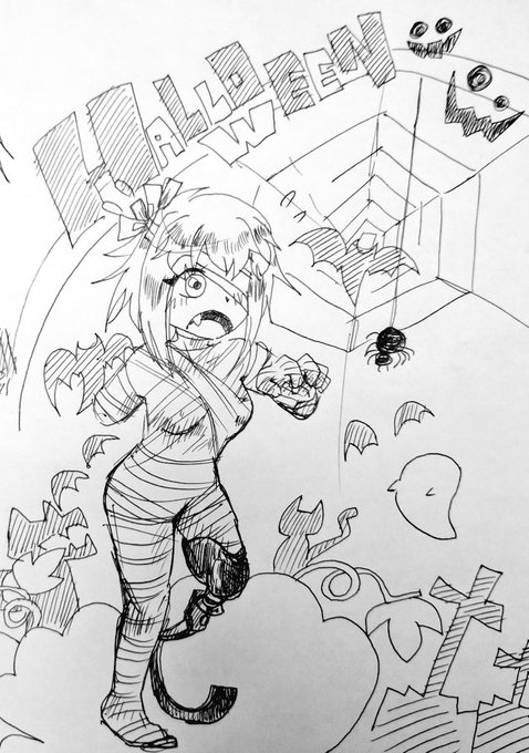 私以外にもいるんだよねそうなんだよね9%のみんな!!ミイラの梢ちゃん描いたよ!!私が見たかったから描いたよ!!競技用義足は趣味だよ!! 髪の毛の描き方が柔らかいんだなあって描いてから気付いた。 #アインバインの平日 twitter.com/bko_pigslicer/…