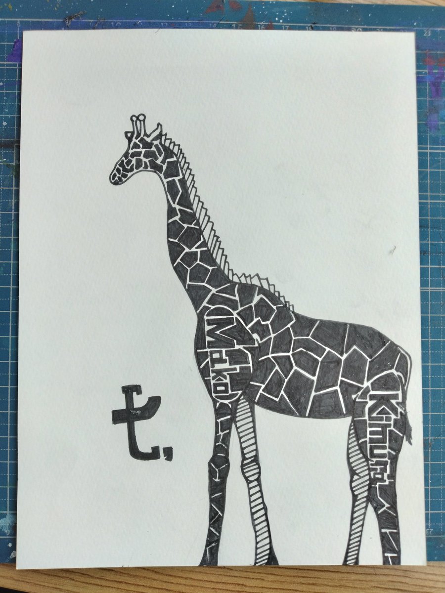 「モノクロ・デザイン」 キリンの模様の中にサインがあります!探してみてください! 2023 03.09 #デザイン #絵師さんと繋がりたい #身寄りなし研究会 #アウトサイダーアーティスト #アウトサイダー #アナログ絵描きさんと繋がりたい #アナログ #キリン #イラスト #イラスト依頼