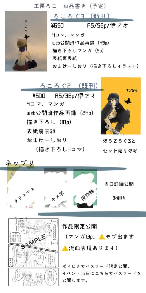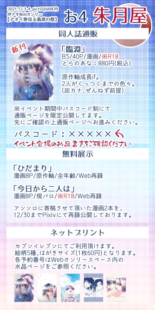 新刊&お品書き出来ましたので改めて☺️ 12/3-4伊アオwebオンリー #アオイ夢見る翡翠の獣 参加します! 新刊(pixiv.net/artworks/94349…)通販は、とらのあなでシークレット公開となります。パスコードは会場内お品書きをご確認ください。 他展示(Pixiv)、ネップリを準備してます!よろしくお願いします🙇♀️