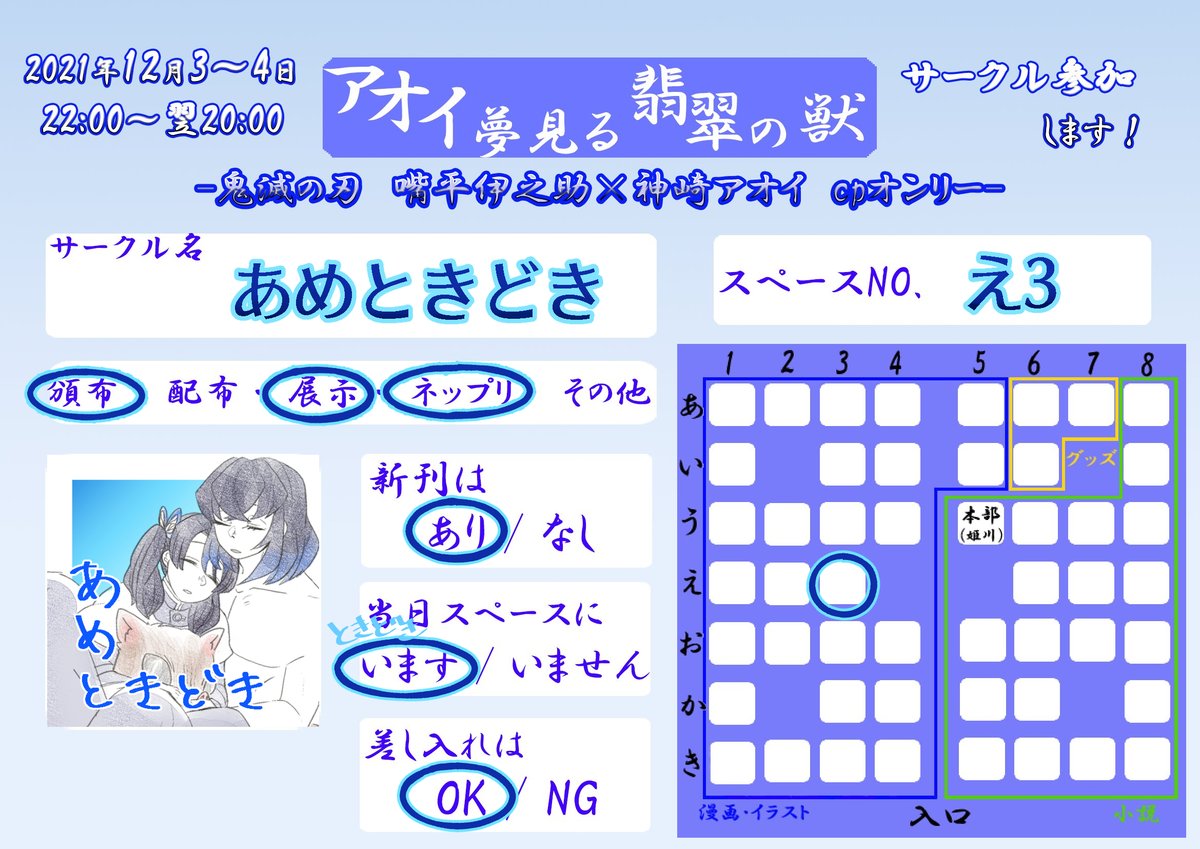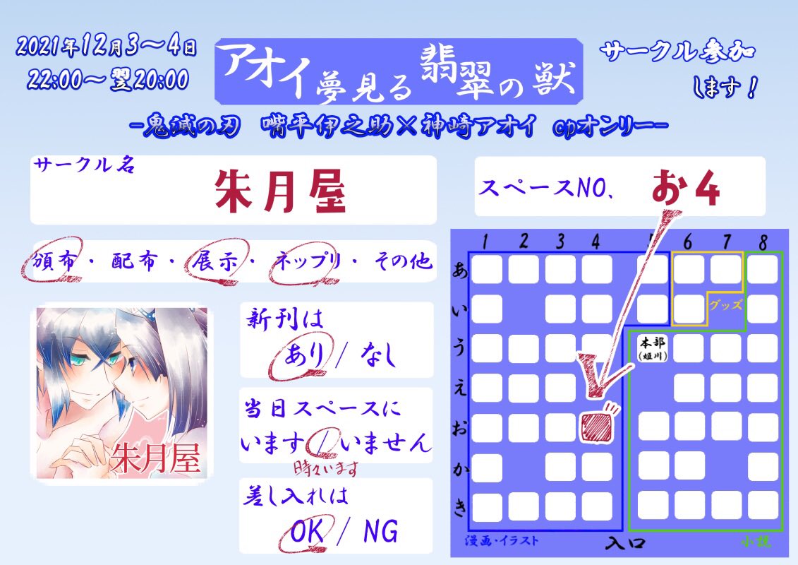 #アオイ夢見る翡翠の獣 サークルカット出来たー✨🙌 12/3の伊アオwebオンリーに参加します☺️ 新刊頒布と再録展示と余裕があればネップリやれたらいいな! まずは新刊出せるようにがんばります!💪💪💪