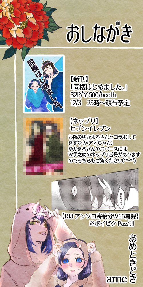 #アオイ夢見る翡翠の獣 伊アオwebオンリー参加させていただきます😊 新刊は遊郭媚薬イチャイチャ本です。詳細はサンプルをご覧ください。ネップリも予定してます。 🦋新刊サンプル🦋pixiv.net/artworks/94198… 🐯 ec.toranoana.jp/joshi_r/ec/ite…(12/4〜) 通販はイベント開始時刻よりBOOTHも開きます🙇♀️