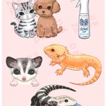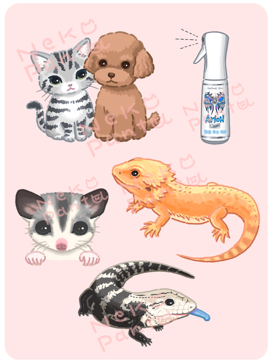 #アリオンジャパン 様のチラシ用イラストを描かせて頂きました! 初めて描いた #フトアゴヒゲトカゲ #アオジタトカゲ #フクロモモンガ 、犬はトイプー、猫はアメショー。ボトルも描いてます。 トカゲさんたちも可愛いですね🦎貴重な機会をありがとうございました! #幕張レプタイルズワールド