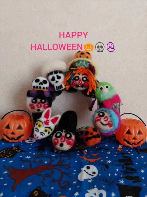 来年はHALLOWEEN四天王に 会えたら良いなぁと思ってリース作ってみました。相方達も作ってみたけど似てたら良いな🎃 皆様楽しいHALLOWEENをお過ごし下さいね🎵 #魔法使いアキットさん #HALLOWEENキャラクター #アキットイズム #羊毛フェルト