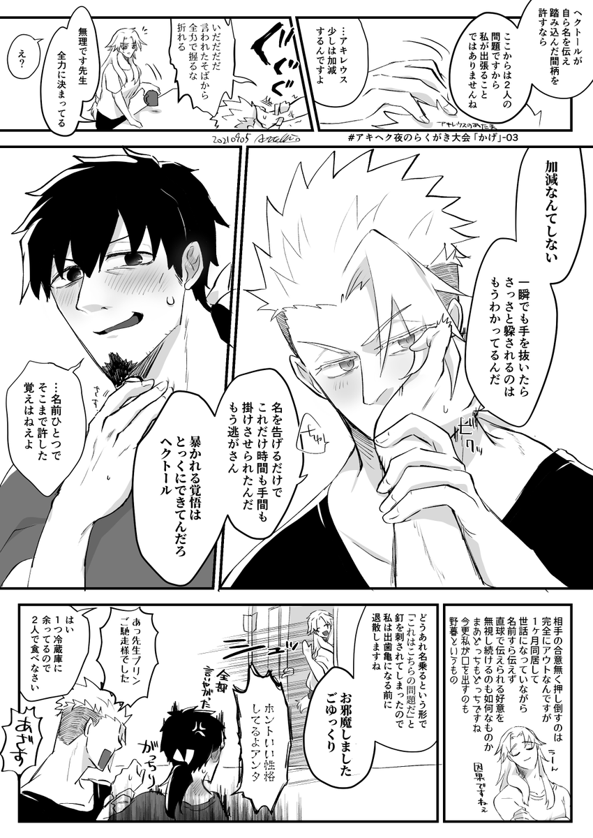 お題:「かげ(加減)」でした。 謎に続くバートロぽい現パロアキヘク 副題は「な」です。やっとちゃんと進展した・・・ ずいぶん前のやつから読んでないとピンとこないかもです。 @akhk_kikaku #アキヘク夜のらくがき大会