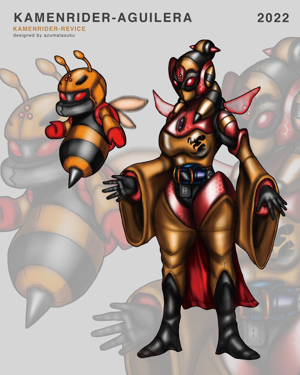 仮面ライダーアギレラ クイーンビーゲノム アギレラがリベラドライバーとクイーンビーバイスタンプを使用して変身した仮面ライダーを想像して描きました。 #仮面ライダーリバイス #FENIXゲノム研究所 #ライダー計画if #アギレラ