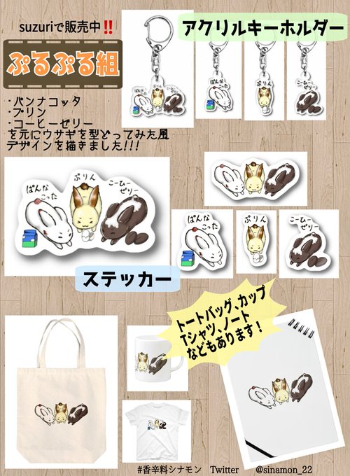 【香モンブランド】 [ぷるぷる組]suzuriで販売中‼️ パンナコッタ・プリン・コーヒーゼリーを元にウサギを型どってみた風のデザインを描きました! 香モン ブランド⬇⬇⬇ suzuri.jp/Kamon22 #香辛料シナモン #アクキー #suzuri #オリジナルグッズ #suzuriで販売中