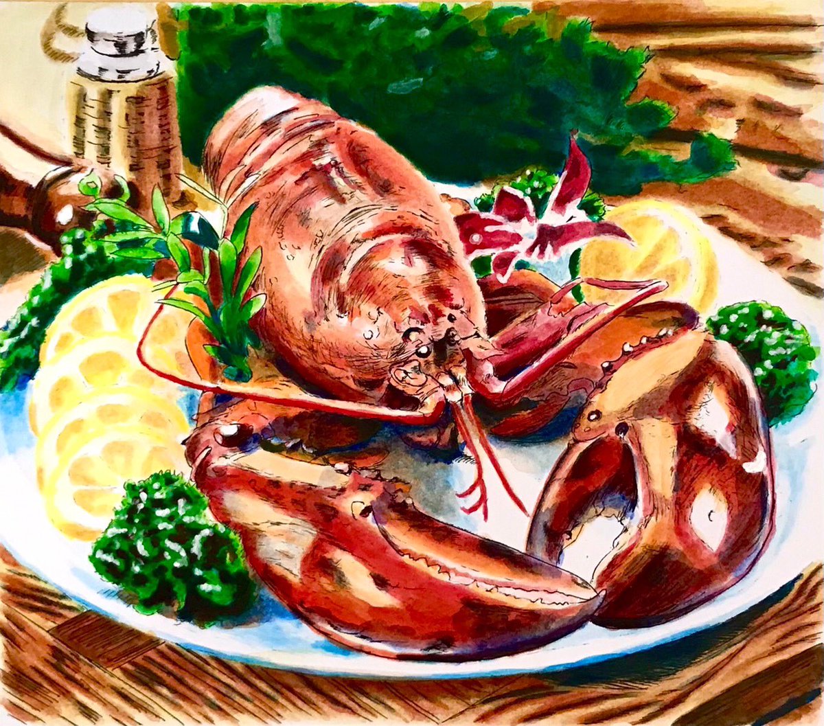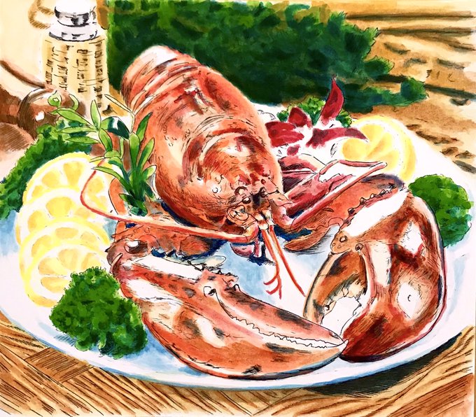 #創作 #イラスト王国 #アナログ画 #絵描きさんと繋がりたい #絵柄が好みって人にフォローされたい #アクリル水彩画 働く振音さん アカ先生 (^ω^)次で完成って所ですね〜 ⸜(*ˊᗜˋ*)⸝わぁ〜い 食べ物の被写体はお昼ご飯を食べてお腹が満たされるとペースがダウンします。